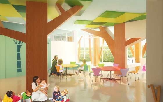 Gli obiettivi principali prevedono sia di valorizzare il più possibile la luce naturale, sia di realizzare spazi “speciali” con una forte connotazione legata al mondo dell’infanzia offrendo con un deciso “distacco” dal contesto per gli adulti degli uffici regionali. Lo sviluppo di tutto il programma funzionale avviene su di un unico livello con l’introduzione di un ampio cuore centrale a doppia altezza. Lo spazio ingresso/atrio di accoglienza, che ha una importanza simbolica segnando il passaggio dalla famiglia alla comunità di bambini ed educatori, ospita eventi ed attività comuni e fornisce qualità allo spazio distributivo. Viceversa le sezioni per le attività ordinarie dell’asilo sono dimensionate alla piccola scala dei bambini e posti in diretto contatto con l’esterno.