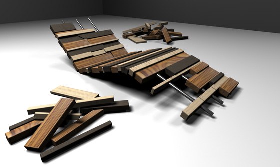 I materiali che compongono la seduta sono entrambi di recupero, quali metallo e listelli di legno. La struttura è composta da tre elementi metallici piegati in due punti. A questi tre elementi vengono inseriti svariati listelli di legno, di molteplici dimensioni e varietà d’essenze. Nel processo di produzione dell’oggetto lo scopo è quello di limitare al massimo l’utilizzo di macchinari perché l’uomo, in parte, deve riappropriarsi del ciclo produttivo, valorizzando al meglio la vocazione artigianale di alcuni prodotti.