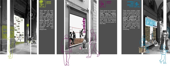 Un’idea che si adatta a qualsiasi città e che dunque non viene contestualizzata in un luogo preciso. «Una proposta che sviluppa una lettura critica del tessuto commerciale urbano per risolvere i requisiti concorsuali in forma singolare e strategica mediante il riutilizzo di spazi esistenti e la costruzione di una rete di micro-interventi».