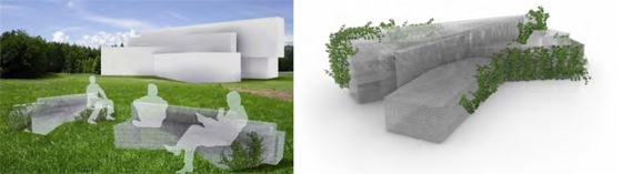 La panchina di Ilaria Marelli ricerca un dialogo costruttivo con il paesaggio circostante, presentandosi come metafora del rapporto tra natura e artificio. Un elemento con struttura in maglia metallica perforata e sagomata in modo da essere orientata in modo da agevolare i flussi delle persone che vi circolano accanto.