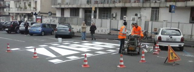 Sull’esempio di tante metropoli del mondo, a Catania, è stato realizzato un esempio di street art: delle strisce pedonali artistiche che si affiancano alla riqualificazione architettonica della piazza, promuovendo un’integrazione tra lo spazio e il contesto, il pedone, l’automobilista, il turista e il curioso, in maniera da relazionarli interattivamente, assegnando loro identità e ruoli specifici. Una iniziativa istituzionalizzata attraverso l’approvazione comunale nonostante la tipologia di intervento. Le strisce pedonali artistiche, infatti, certamente non sono estranee a molte città europee ma sono pressoché sconosciute in Italia.