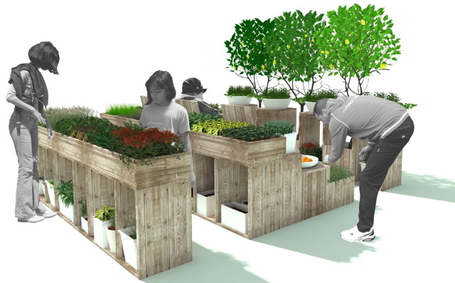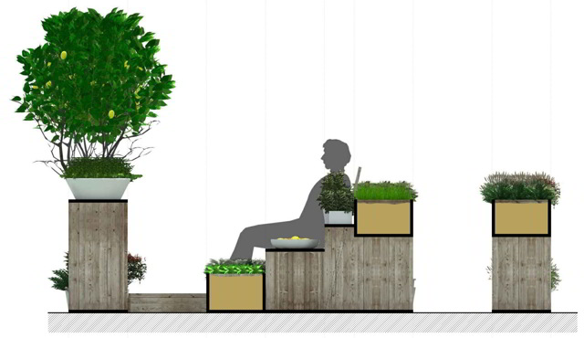 L’allestimento proposto si configura come unione di elementi modulari già montati separatamente e assemblati sul luogo. Le loro differenti quote (alle quali corrispondono le diverse funzioni per cui tali elementi sono stati pensati) e le geometrie squadrate, ricordano lo skyline della città. In questo senso, l’orto rimanda ad un microcosmo urbano: gli edifici e la strada, i basamenti e le coperture, i vuoti e i pieni. Si crea, quindi, un piccolo luogo verde in cui riscoprire l’elevato potenziale che l’orto rappresenta, quale nuovo modello di utilizzo dello spazio collettivo, anche grazie all’introduzione del dato sensoriale che il progetto contempla.