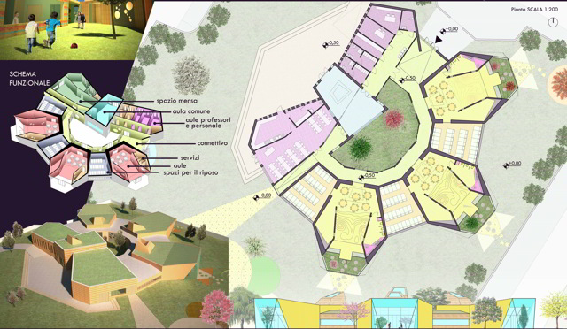 Il concorso, organizzato da Federlegno Arredo S.r.l. per MADE expo, in collaborazione con il DAStU, Dipartimento di Architettura e Studi Urbani del Politecnico di Milano, richiedeva a neolaureati e a studenti di Architettura, Ingegneria ed Industrial Design, di progettare una scuola per l’infanzia innovativa sul piano dell’articolazione spaziale delle diverse funzioni che su quello della sperimentazione dei materiali e delle tecniche strettamente correlate ad una originale sensibilità ambientale.