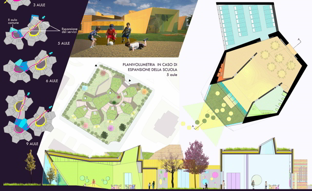Come in un gioco di incastri, ciascuna unità funzionale può essere aggregata all’altra in maniera differente a seconda del crescere del numero di aule. Le configurazioni possibili sono pensate per 3, 5 e 6 aule, prevedendo anche un’eventuale espansione dei servizi.
