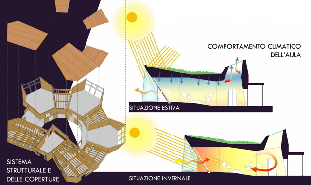 La conformazione di ciascuna aula è ottimizzata in relazione al percorso solare, in modo da ottenere un buon comportamento climatico in inverno ed in estate. La parete che dà verso l’esterno è inclinata in modo da ricevere i raggi solari in inverno e creare una ampia zona d’ombra in estate, quando il sole è alto. A migliorare la ventilazione in estate, è un lucernario, che sfrutta l’effetto camino, disperdendo l’aria più calda. La copertura viene pensata come tetto-giardino, in modo da favorire l’inerzia termica e l’assorbimento del calore durante l’estate.