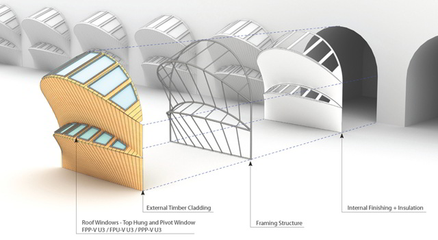 Il sistema è completamente adattabile a qualsiasi dimensione, proporzione o tipologia di arcata. L’uso di software di modellazione parametrica permette di fornire al produttore tutte le specifiche di costruzione partendo da sole quattro dimensioni rilevate in loco. Lo scopo è creare un nuovo modo di vivere in una città globale come Londra.