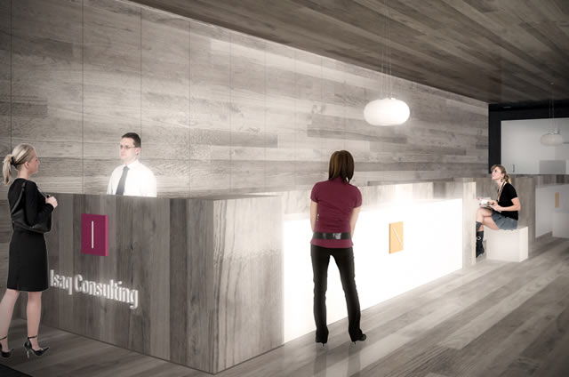 L’idea progettuale gioca sul tema della «scatola nella scatola». Le aree funzionali sono concepite come indipendenti ma allo stesso tempo connesse con l’intorno. Gli uffici pensati come spazi di lavoro «confinati» sono organizzati attorno ad una zona centrale, il «cuore del progetto», formata da un patio coperto e posto in continuità con un’area open space dove trovano posto i front office (Isaq Consulting, Fiscale e Lavoro), lo spazio “Tradecom” e un’area di servizio per gli utenti denominata “Nuovi Modi” in cui, grazie all’uso della tecnologia, i fruitori possono trovare un primo punto di ascolto.