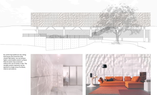 Da una combinazione tra le tecniche di laminazione dell’argilla e dalla fabbricazione robotica a scala industriale nasce una piastrella in ceramica personalizzabile. La superficie della piastrella viene disegnata usando Rhino e Grasshopper poi modellata attraverso un robot che simula il meccanismo impiegato dalle macchine a controllo numerico. Un processo quindi che non prevede alcun utilizzo di forme o stampi e che dà vita ad un elemento che può adattarsi a usi diversi (rivestimenti per interni o per esterni).