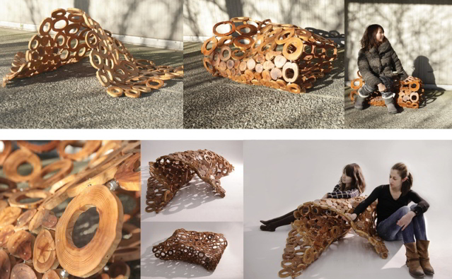 Il progetto si ispira alle tradizionali stoffe giapponesi che, sapientemente piegate, servivano per trasportare vestiti, regali ed altri oggetti. Dalla tradizione il nuovo oggetto di design prende a prestito la malleabilità, cambia invece il materiale costitutivo. L’oggetto utilizza infatti elementi circolari in legno che formano una superficie capace di assumere infinite conformazioni tridimensionali, adattandosi a molteplici usi all’interno di un ambiente domestico e non solo. L’essenza utilizzata è il tasso, un legno impiegato nei giardini a scopi ornamentali.