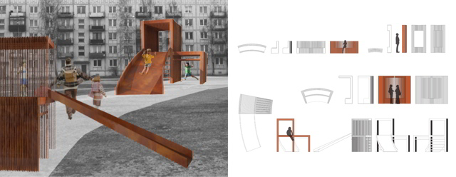 Scelto per il suo legame con il contesto e per la sua visione su larga scala, la proposta riutilizza blocchi abitativi di epoca sovietica per dar vita a nuovi spazi per la comunità. Le strutture residenziali brutaliste, abbandonate, vengono disseminate per la città a formare delle sculture abitabili. Il riferimento è Bernard Tschumi e il Parco de la Villette a Parigi.
