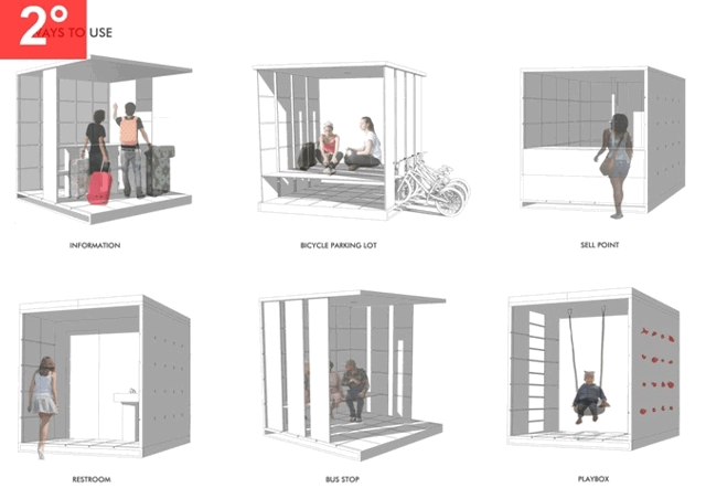 Il modulo è composto da due mura solide, forate per permettere il passaggio della luce, e da elementi multifunzionali che possono essere spostati a seconda delle esigenze. Gli elementi, assemblati in più modi, possono dar vita a punti vendita, pensiline per le fermate degli autobus, panchine, toilette, etc..
