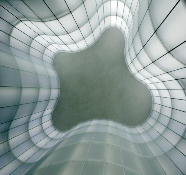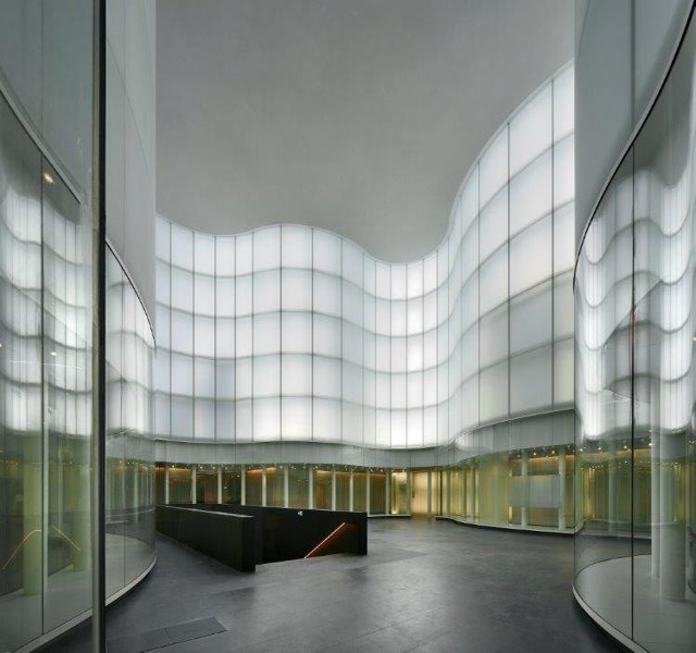 Il corpo centrale è caratterizzato dall’atrio completamente vetrato messo in opera con una particolare forma organica con sagoma ondulata, a riprendere il concetto di piazza coperta, attorno alla quale si aprono le sale espositive modificabili in modo flessibile. Il volume, costruito in vetro acidato con superfici paraboliche, funge da lanterna per la città nelle ore serali.