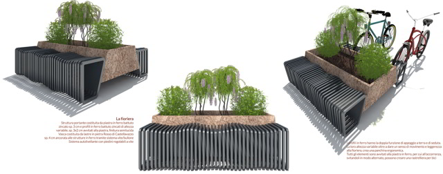 Alcuni profili danno vita ad un movimento che contribuisce a conferire leggerezza alla fioriera, grazie anche alla proiezione della loro ombra a terra che crea caratteristici effetti. Inoltre essi con il loro movimento ondulato creano una seduta dalla forma ergonomica. Tutti i profili in ferro sono avvitati e facilmente smontabili dalla piastra piena di sostegno, per cui, possono trasformarsi in una rastrelliera per bici.