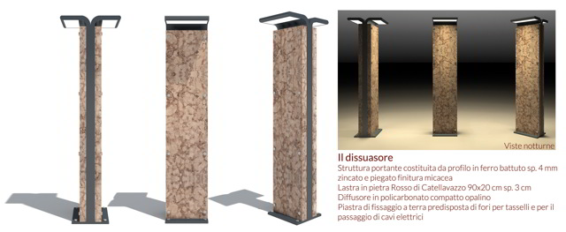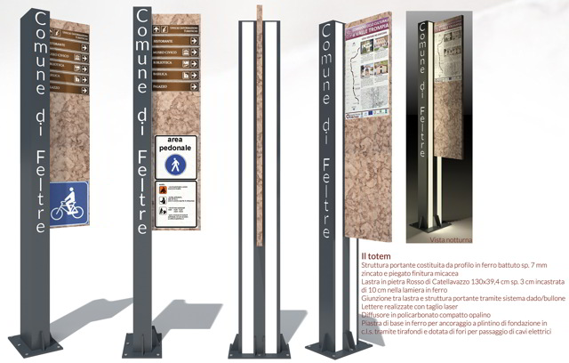 Ancora una volta la finitura superficiale, grossolanamente spuntata a mano, vuol richiamare alla mente la cava e la lavorazione artigianale degli scalpellini. La scritta con il nome del Comune è fresata a laser nella struttura in ferro. A retroilluminare le scritte ci pensano un diffusore in policarbonato opalino ed una fascia di LED posizionata su tutta l’altezza del totem.