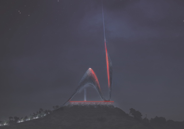 Disegnano l’antenna come «un arco integrato in alluminio», luminoso, capace di contenere l’altezza prevista di 90 metri che comprende una zona tecnica di ripetitori ispezionabile e ampliabile a seconda delle necessità. La struttura e il rivestimento sono interamente realizzati in pannelli di alluminio con forature su misura. Sulla schiena del corpo – antenna vengono collocati dei film solari per garantire l’efficienza energetica e l’alimentazione del parco e della stessa antenna che di notte si illumina.