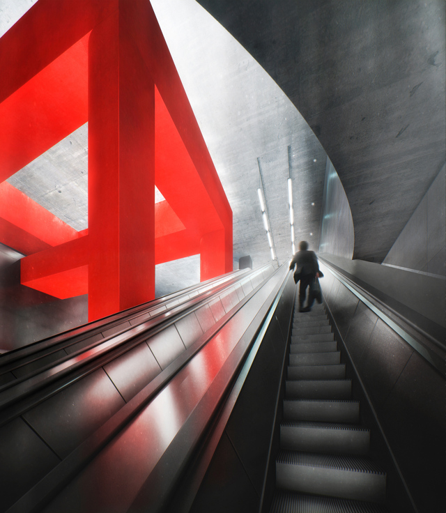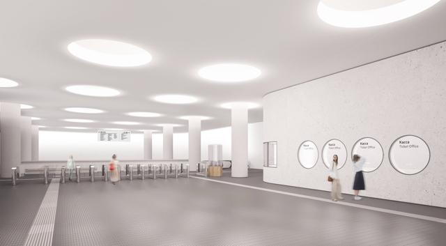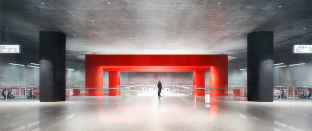 Nella grande hall con la sua biglietteria i progettisti lavorano per dare risalto a forme pure e creare visuali dinamiche. Una struttura rossa discende verso la piattaforma di transito dei treni, creando un elemento distintivo che unisce visivamente i due spazi, quello dell’atrio e quello della banchina.
