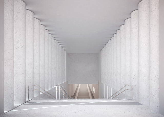 Pochi dettagli e molta luce per i sottopassaggi. La parete semicircolare della hall è rivestita di specchi in cui i passeggeri possono vedersi riflessi. Inoltre, il riflesso degli apparecchi di illuminazione e dei pilastri contribuisce ad amplificare lo spazio e a diffondere la luce. Anche a livello della banchina si gioca impiegando materiali riflettenti tra questi: metallo e granito.