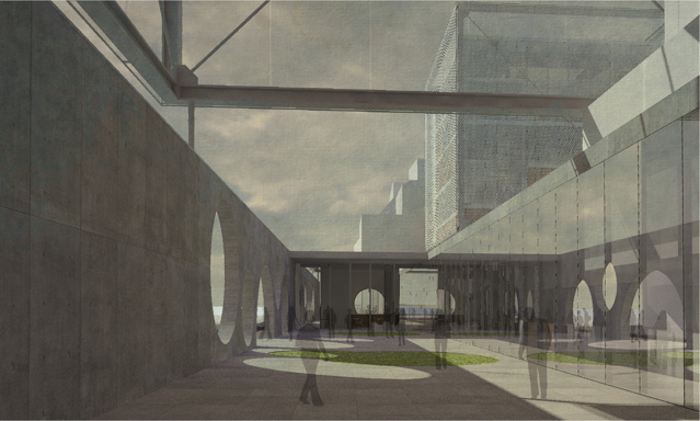 La loro proposta prevede volumi fluttuanti che ospitano al loro interno le funzioni accademiche, quali le aule, una biblioteca, etc.., mentre lo spazio pubblico è concepito in continuità con la vita urbana.