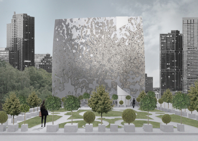 Il terzo posto va ai giovani svizzeri Alina Kvirkveliya e Sacha Gengler. La loro proposta: un cubo leggermente bombato e rivestito da una membrana vetrata che produce una riflessione distorta dell’ambiente circostante. All’interno una sala espositiva concepita come un grande vuoto.