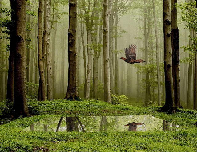 Uno specchio, poggiato sul terreno, si prende gioco della natura, del cielo, degli alberi, delle nuvole, dell’uccello in volo e dell’uomo che in esso si riflettono. Integrato nel terreno, riflette la natura che l’accoglie, restituisce l’immagine del paesaggio circostante, capovolto ma simmetrico. La percezione visiva della natura riflessa nello specchio attrae il visitatore e al contempo l’inganna. Come Narciso, egli non osserva la realtà ma ne contempla l’immagine. E duplice è l’inganno se quella che appare come la superficie calma di un piccolo stagno si rivela essere un elemento artificiale, corpo estraneo in un ambiente naturale.