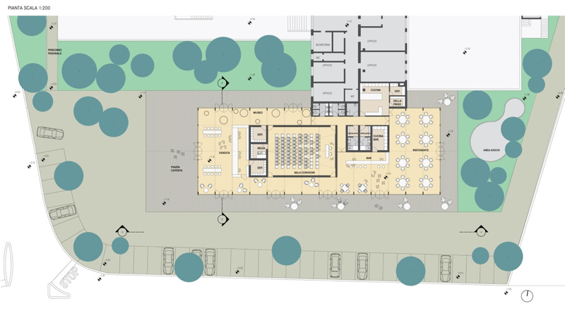 Sul perimetro vengono invece collocati gli spazi di accoglienza della clientela: lo spaccio, il bar, il ristorante e l’area museale, posti in una linea continua pensata per favorire la commistione di funzioni e coinvolgere i visitatori.