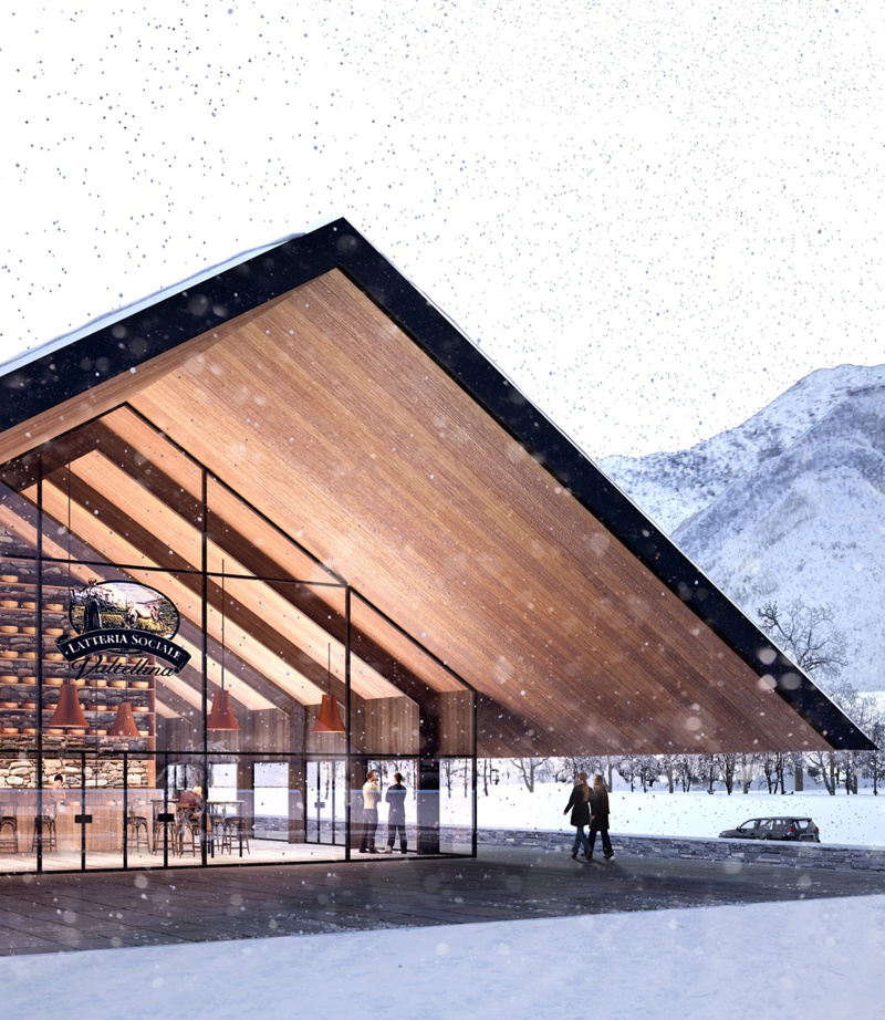 Lo studio milanese, fondato da Francesco Fresa, Germán Fuenmayor, Gino Garbellini e Monica Tricario, reinterpreta la malga, la tipica costruzione della tradizione alpina, caratterizzata dal basso profilo, il volume unico sviluppato in lunghezza all’interno del quale trovano spazio i luoghi di vendita, esposizione e lavoro dell’azienda casearia.