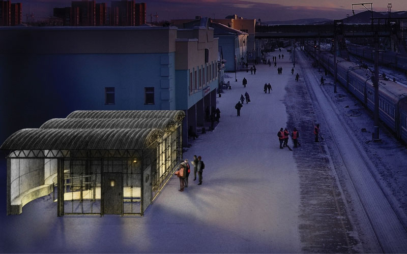 La costruzione riprende la forma tradizionale degli edifici siberiani, caratterizzata da geometrie molto forti, e si pone come punto di riferimento riconoscibile lungo questo percorso ferroviario storico.