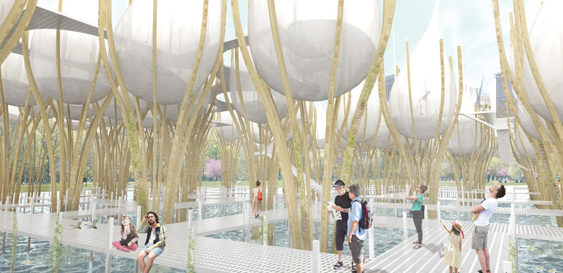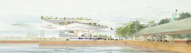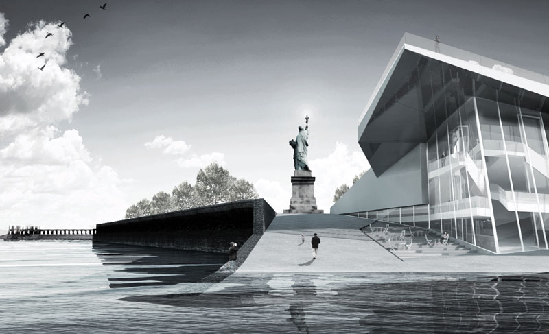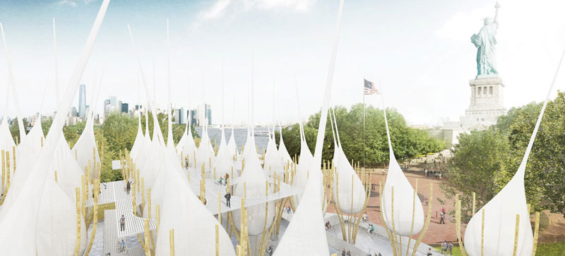 Grandi gigli d’acqua definiscono il paesaggio che circonda la Statua della Libertà, animando la fantasia e toccando emotivamente chi li osserva. Questa è la caratteristica che si nota immediatamente nel progetto posizionatosi al di sopra di tutti gli altri. Osservando in maniera più approfondita, l’immagine iniziale viene arricchita dall’idea che si tratti di unità mobili concepite dal progettista come un modo per raccontare lo “stato del mondo” in termini di diritti umani e di giustizia sociale. Il continuo cambiamento vuole affermare che, sebbene non si riesca a raggiungere la vera libertà nel mondo, almeno la speranza non muore mai. Contemporaneamente il paesaggio architettonico diventa parte integrante della Statua e la arricchisce creando, sotto di essa, un mare gocce d’acqua in movimento dall’aspetto estremamente poetico.