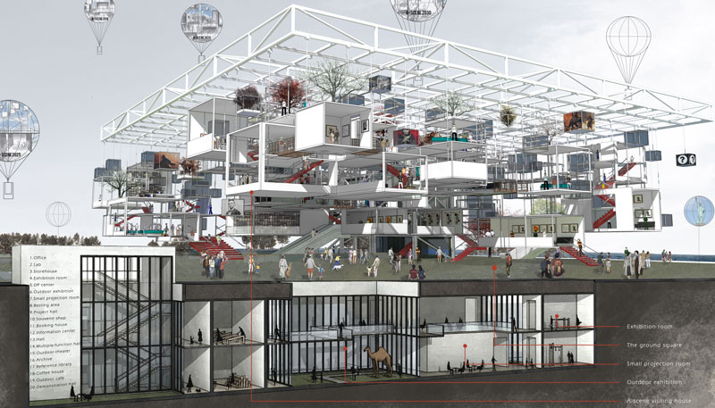 Se queste considerazioni sono relative all’osservazione dell’esterno da una lunga distanza, la sezione dimostra in maniera più approfondita come anche gli spazi interni siano stati pensati in maniera interessante e stimolante. Il progetto, infatti, è molto efficiente nel suo insieme, il concetto è ben presentato ed è corredato dalla giusta quantità di dettagli, riuscendo ad evocare un’immagine forte e bella.