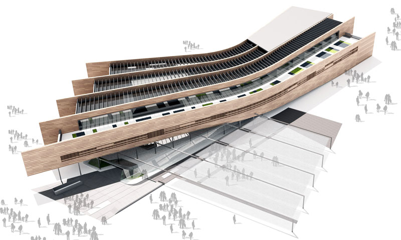 Il progetto è basato sulla permeabilità dell’area, attraverso l’utilizzo di spazi verdi e coni visivi molto profondi, e dell’edificio stesso, pensato in modo da poter ospitare importanti funzioni pubbliche e aziendali. La struttura è leggera e riprende le traiettorie dinamiche dei solchi infrastrutturali, prestandosi tanto ad una percezione veloce quanto ad un’esplorazione lenta, a misura d’uomo.