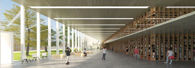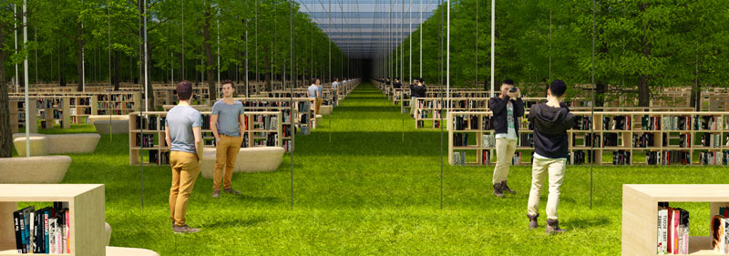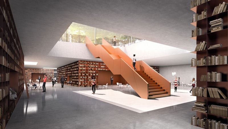 La proposta vincitrice appare a prima vista un’architettura convenzionale che risponde semplicemente a un bando lanciato per dare al parco un nuovo assetto. Invece, al di là del suo aspetto esteriore così ortodosso, l’edificio crea un “mondo nascosto”, un nuovo parco con un orizzonte apparentemente infinito e degli spazi contenenti libri e volumi che sembrano non avere un termine.