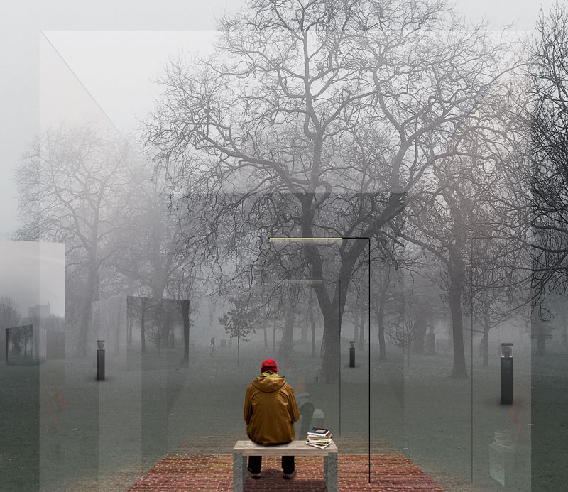 Proprio da Hyde Park la progettista ha tratto ispirazione, osservando in maniera molto accurata le panchine esistenti. A partire da quelle è stata definita una griglia di sedute, alcune delle quali coperte da padiglioni di vetro che fungono da sale lettura, a completa disposizione dei visitatori. L’idea crea un’interessante legame con la disposizione casuale degli alberi e le dolci curve disegnate dalle chiusure di vetro dei padiglioni.