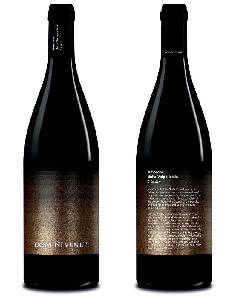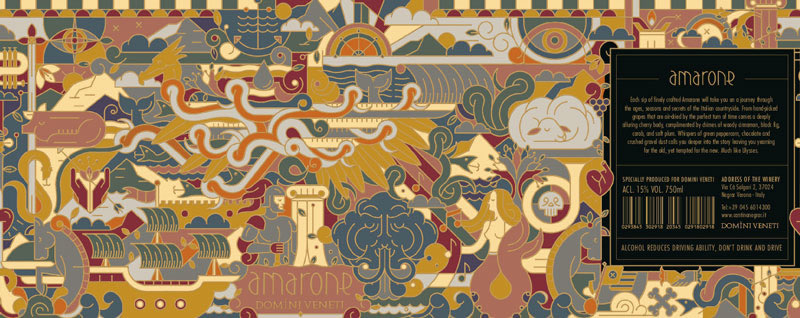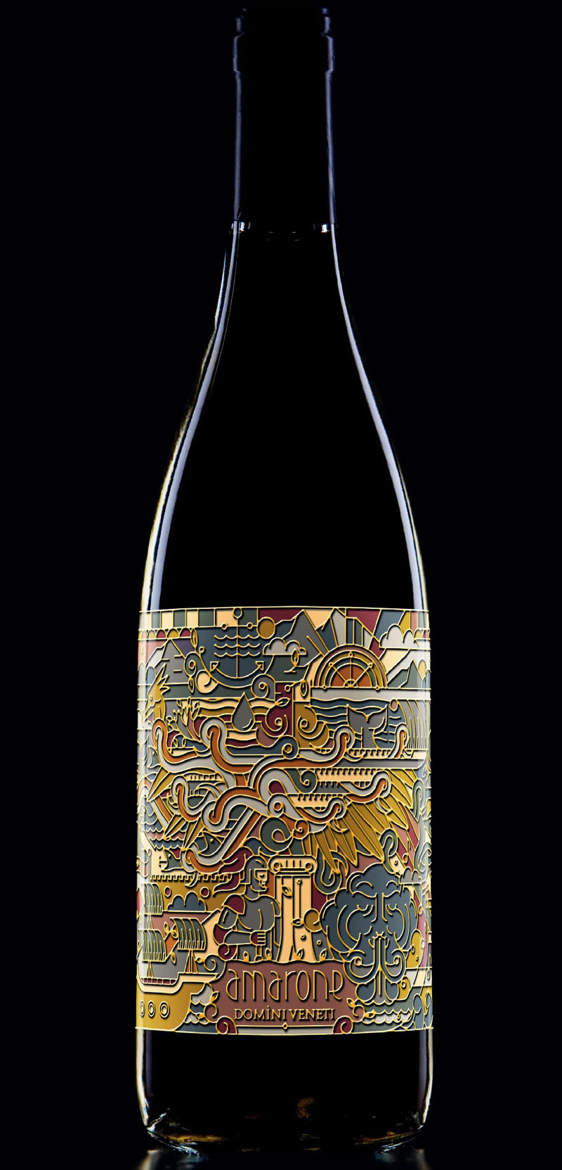 Amarone abbraccia la storia, la tradizione e la scienza. L’etichetta attira l’occhio del cliente, lo affascina e lo trasporta verso un mondo perduto fatto di scoperte, magie e leggende.