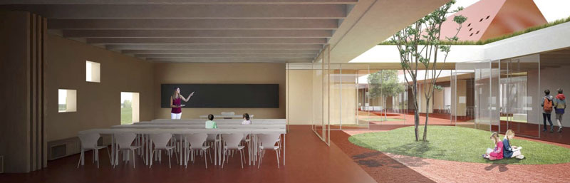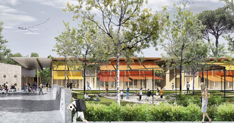 Il progetto sviluppa una interessante distribuzione planimetrica organizzata intorno a una grande piazza di ingresso. I volumi della scuola hanno una buona distribuzione, appositamente ruotati per cogliere al meglio la luce solare, e una piacevole disposizione rispetto alle aree verdi.