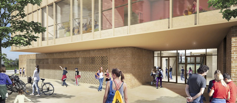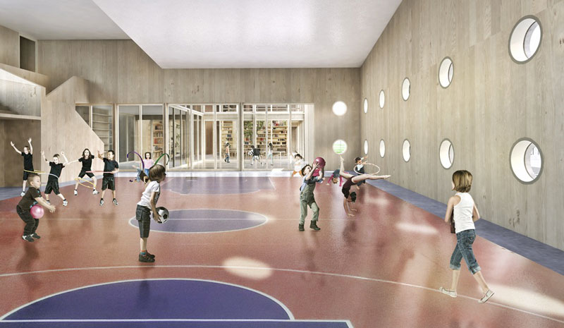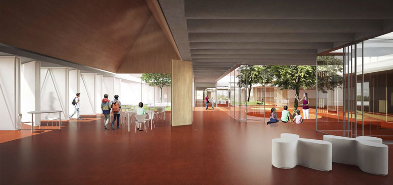 L’impostazione planimetrica consente la creazione di una grande piazza d’ingresso parzialmente coperta che disimpegna la palestra, intesa come un corpo separato ma funzionalmente collegato all’edificio principale.
