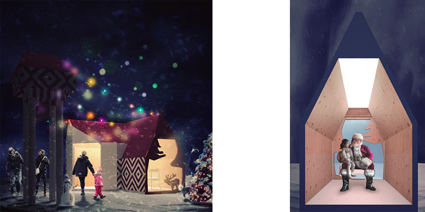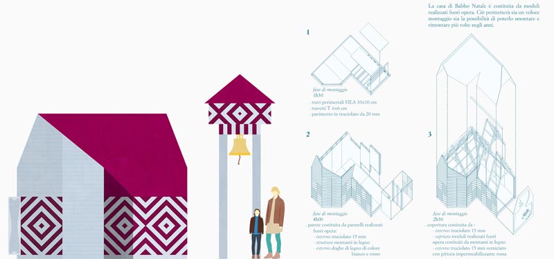 Coerentemente con gli obiettivi del concorso il progetto vincitore unisce alla creatività progettuale un’attenzione alla realizzazione. Formalmente ispirato dalle immaginazioni infantili, la casa di Babbo Natale diventa un riparo dal ripido tetto a falde dove l’atmosfera natalizia si rispecchia in ogni decorazione e scelta cromatica del rivestimento; l’architettura si riveste degli stessi colori di Babbo Natale per accogliere bambini di ogni età in un’atmosfera magica e suggestiva. Composto da moduli realizzati fuori opera, la nuova casetta di Babbo Natale è facilmente montabile e smontabile, i tempi di assemblaggio ridotti rendono il progetto di facile riutilizzo durante diverse manifestazioni, assicurandogli quindi una flessibilità d’impiego che era una richiesta principale del bando.