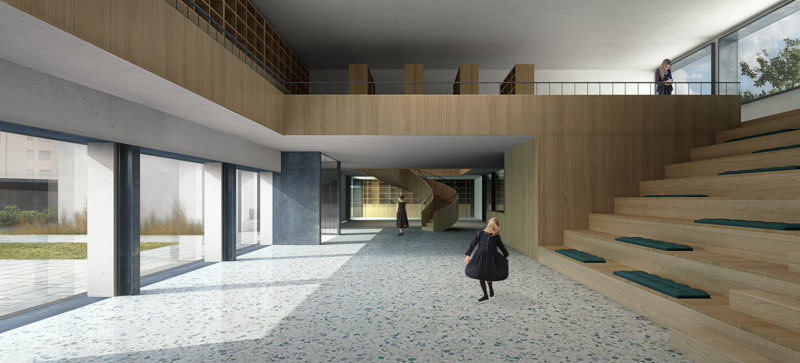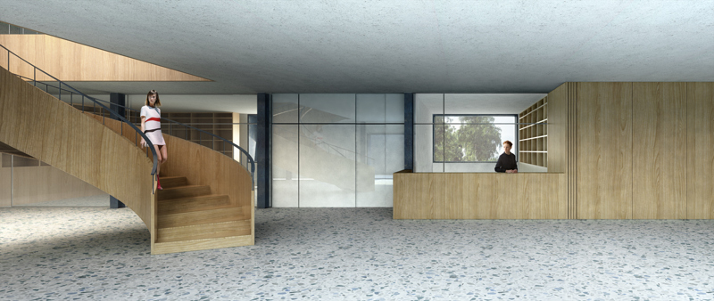Per gli uffici il “fuoco” centrale è dato da una grande scala elicoidale che mette in collegamento il grande atrio del piano terra con gli spazi che verranno occupati dalle sedi distaccate del comune. La sala polifunzionale del piano terra, che non vuole essere solo uno spazio utilizzato in occasione di eventi, ma anche un punto di sosta e di passaggio, è invece caratterizzata da una gradonata che dà accesso alla biblioteca del piano superiore. Oltre a funzionare da collegamento verticale, la grande scalinata funge anche da seduta in occasione di eventi.