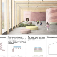 - l’agorà, (che dà accesso alle 5 aule-laboratorio e all’aula di rotazione), concepita come elemento di continuità visiva e spaziale tra esterno ed interno, ambiente dinamico e flessibile che mette in relazione ordine compositivo, tipologico-distributivo e funzionale attraverso spazialità differenti, dalle più ampie e aperte per relazioni e attività di gruppo a più piccole e raccolte, per quelle individuali e scambi comunicativi.