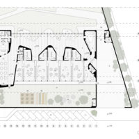 L’edificio è formalmente generato dal recinto che, abbracciando l’intero lotto e grazie al suo movimento in pianta, articola gli ambienti della scuola accogliendone alcuni al suo interno, in un gioco di dilatazioni e restringimenti spaziali atti ad ospitare le zone distributive.