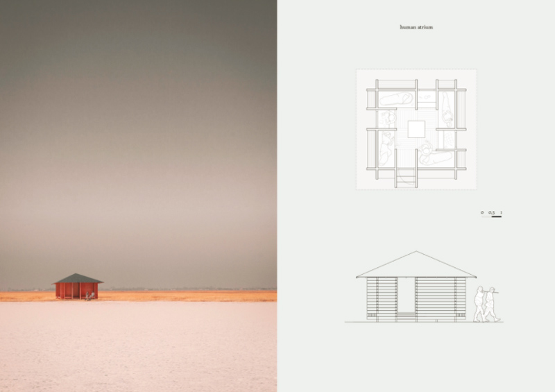 Anche la cabina prende ispirazioni dal contesto, rivisitando l’architettura vernacolare lettone in chiave contemporanea. Dall’esterno infatti riprende le forme primitive delle capanne, ma all’interno gli ambienti acquistano un nuovo significato. Per coniugare spazi collettivi e privati la cabina si struttura intorno ad un centro circolare aperto, circondato e protetto dalle quattro stanze disposte sugli angoli, permettendo uno spazio privato ad ogni escursionista. È stata proprio la tensione tra l’archetipo vernacolare e l’originalità spaziale della tipologia abitativa a convincere maggiormente i giudici.