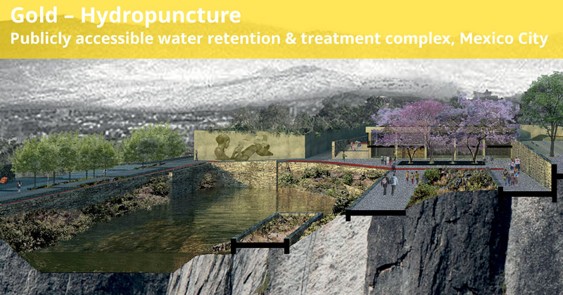 Hydropuncture è un complesso di trattamento dell’acqua aperto al pubblico in una zona disagiata di Città del Messico, il progetto mescola bacini idrici e strutture pubbliche con spazi che seguono la logica del fluire dell’acqua. Il team di progetto è condotto da Loreta Castro Reguera di Taller Capital, in collaborazione con il ricercatore Manuel Perló Cohen dell’Universidad Nacional Autónoma de México.