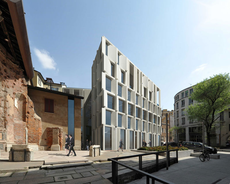 Milano ritorna invece nella facciata, tripartita e vibrante, in cui si è scelto di mettere in evidenza la maglia strutturale di pilastri e solai per riproporre la ritmicità tipica degli edifici del centro storico del capoluogo lombardo. Su questo sistema rigido sono stati sovrapposti elementi prefabbricati di sette dimensioni diverse, che, posti in senso obliquo rispetto alla linea di facciata, animano di luci ed ombre il prospetto.