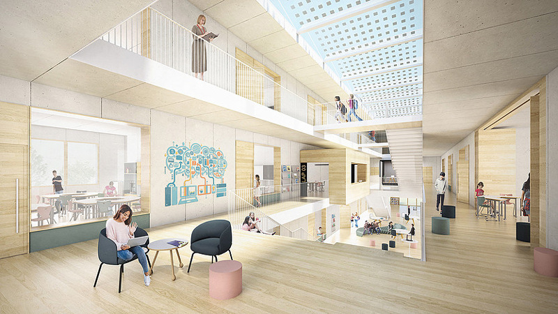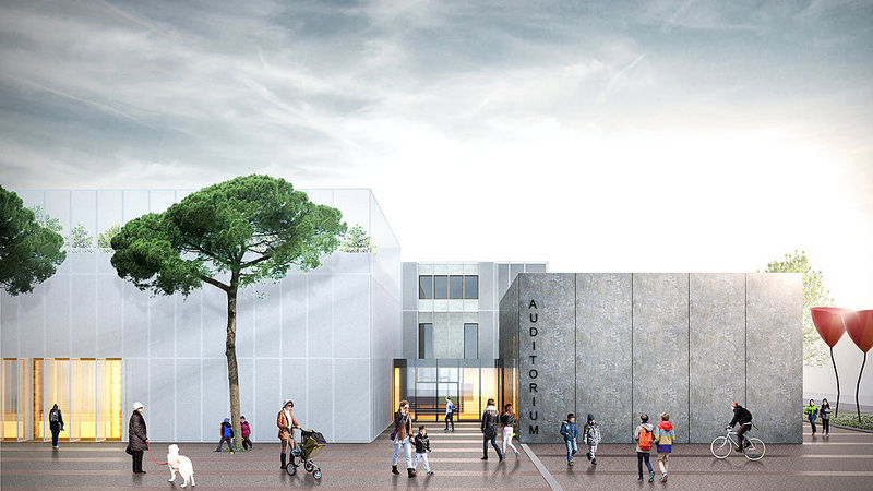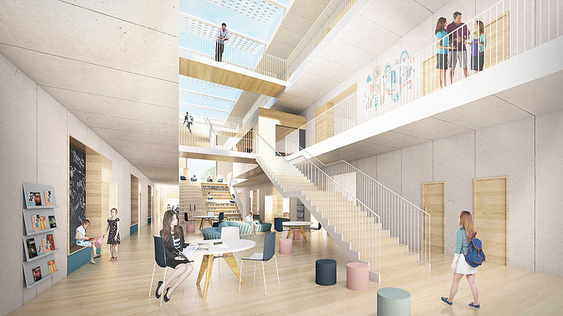 Per la nuova scuola, i vincitori hanno immaginato tre volumi semplici, contenenti rispettivamente le aule, la palestra e l’auditorium. L’auditorium e la palestra rappresentano il fronte pubblico, fruibili dall’intera comunità. Alle spalle, si colloca il volume più grande, contenente la scuola, oltre la quale si sviluppa un grande giardino. Il distacco tra i blocchi permette di creare una strada interna, protetta, dove affacciano i laboratori.